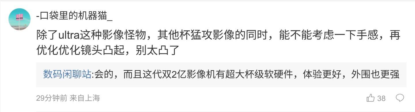 后续有用户在评论区表示:“除了 ultra 这种影像怪物,其他杯猛攻影像的同时,能不能考虑一下手感,再优化优化镜头凸起,别太凸了”,博主回复道:“会的,而且这代双 2 亿影像机有超大杯级软硬件,体验更好,外围也更强”。